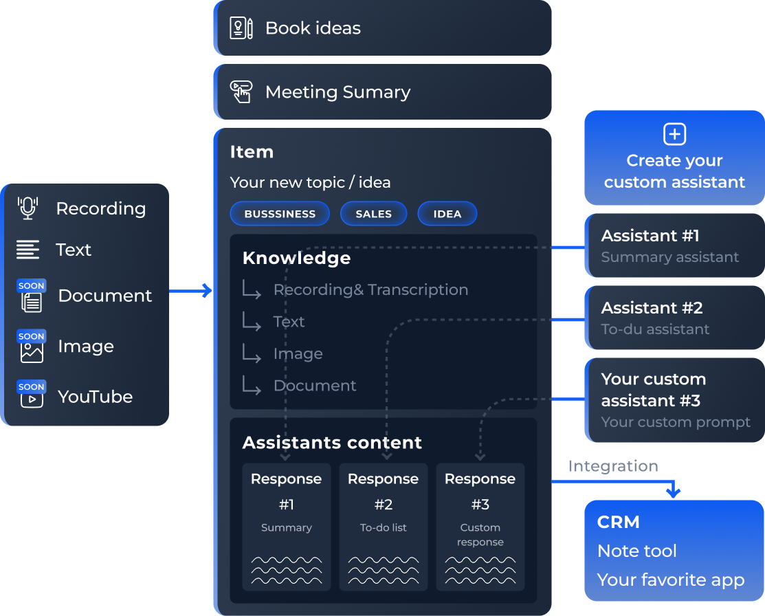 Assistants can also be integrated with your work tools — thanks to this, processed information is automatically transferred, for example, to your CRM, project management tools, or other applications you use every day.