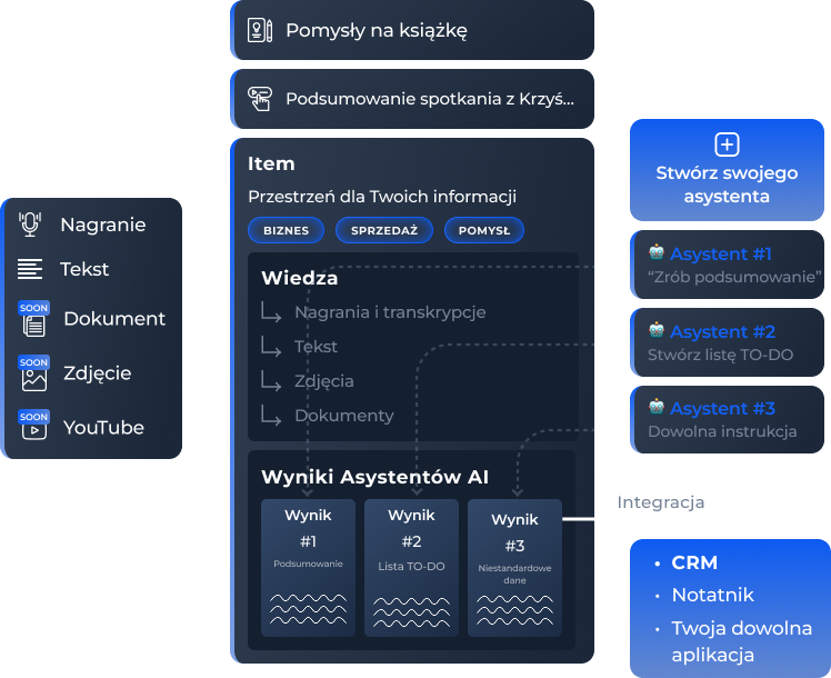 Asystenci mogą być również zintegrowani z Twoimi narzędziami pracy — dzięki temu przetworzone informacje automatycznie trafią np. do CRM-u, narzędzi projektowych czy innych aplikacji, z których korzystasz na co dzień.